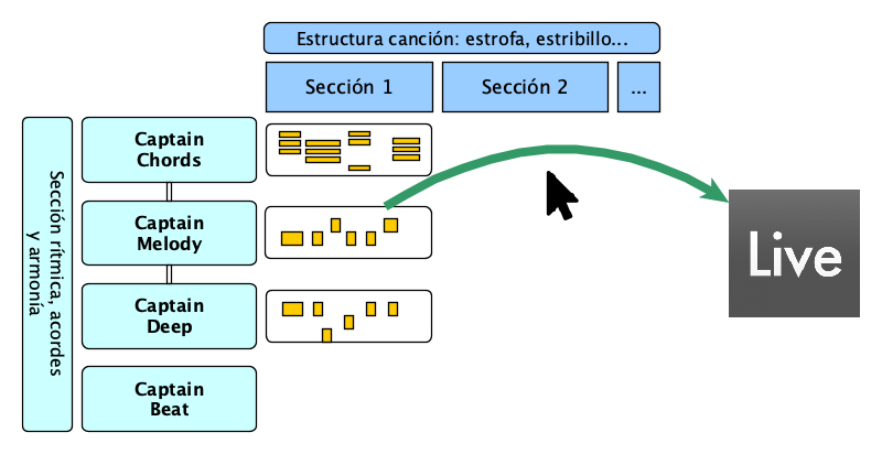 Esos elementos básicos son una progresión de acordes (Captain Chords), una línea de bajo (Captain Deep), la percusión (Captain Beat) y una melodía (Captain Melody). Por otro lado tenemos una dimensión estructural de la composición que nos permite trabajar por separado en las secciones de la canción como la estrofa o el estribillo.