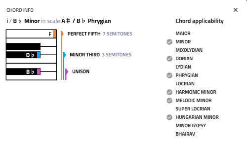 Por cada acorde podemos ver inmediatamente las notas que lo componen y su nombre y grado. Cada grado tiene un código de color que identifica el nivel de tensión que se genera, o su estabilidad para el oído humano.