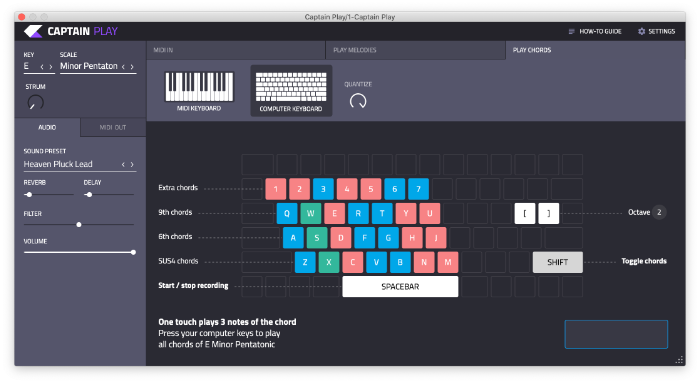 Dije que son cinco plugins pero solo he mencionado cuatro, porque el quinto es una herramienta transversal que usan Chords, Deep y Melody y que se puede usar por separado. Captain Play es una forma de tocar con el teclado del ordenador en una determinada tonalidad, pudiendo acceder a los acordes de cada uno de los grados de forma sencilla. Con un teclado midi permite mapear cada tecla a un acorde y podemos poner diferentes "sabores" de acordes en cada octava.