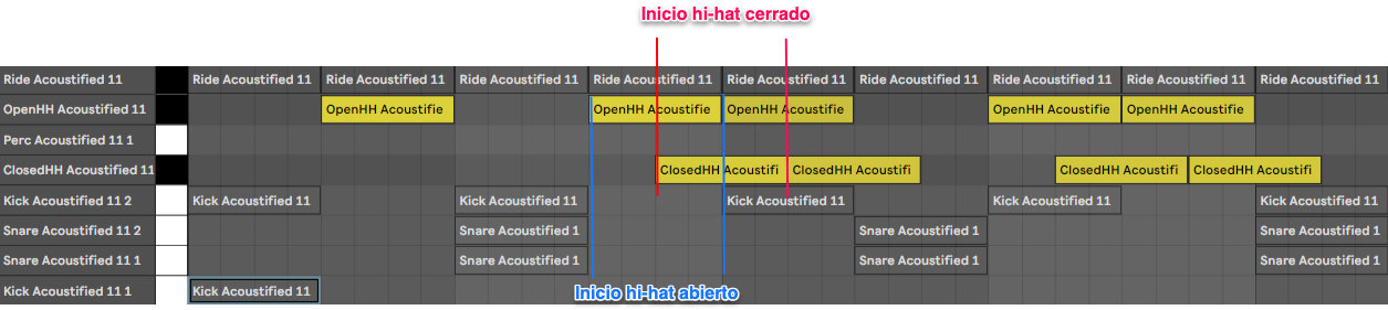 Tenemos un drum rack inicialmente sin usar choke groups. Este se alimenta con un clip MIDI en el que hay secuencias de hi-hat abierto y cerrado que se superponen.