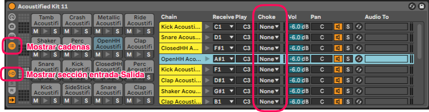 Pero veamos el ejemplo clásico del hi-hat, que en la mayoría de los drum racks predefinidos en Live viene ya en el mismo grupo, pero a veces puede ser que quieras montar uno de cero con samples externos a Live.