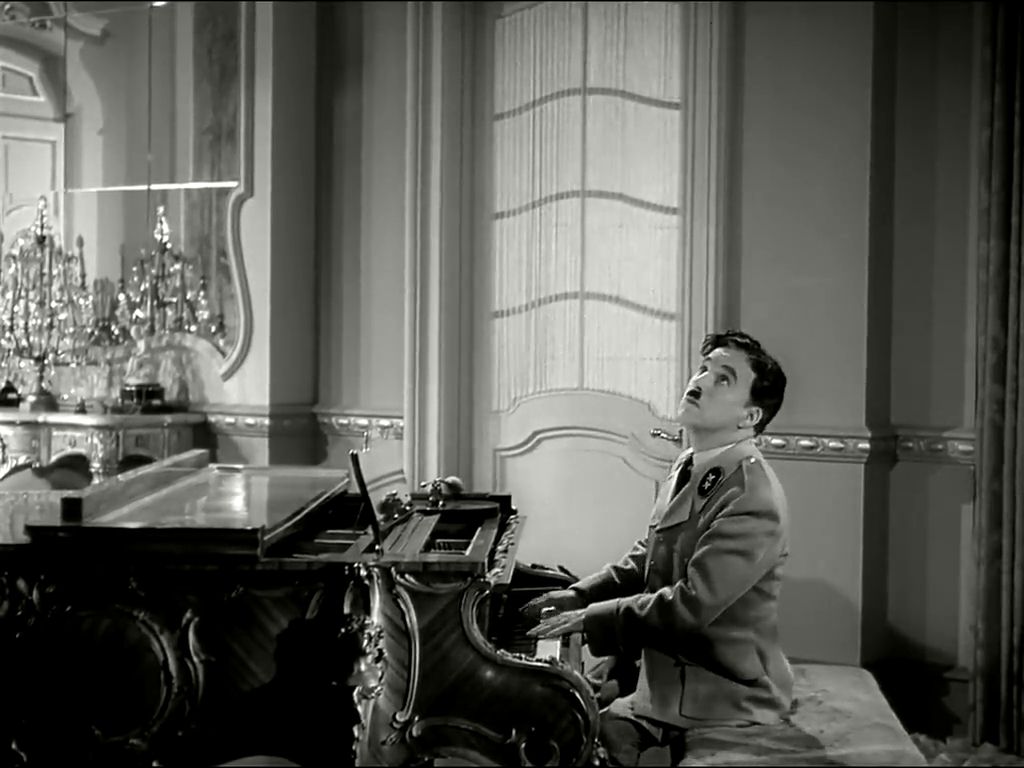 Pues no, habría sido gracioso que tocara algo de Wagner, pero en este fotograma Adenoid Hynkel, lider supremo de Tomania, tocaba al piano unos arpegios y algo que me recuerda a la cadencia andaluza o a la Suite Iberia de Albeniz. Sin embargo, en esta sátira de Chaplin si que suena Wagner, más tarde en la famosa escena del baile con el globo terráqueo, dónde podemos escuchar de fondo el preludio del primer acto de Lohengrin, la ópera favorita del dictador referenciado.