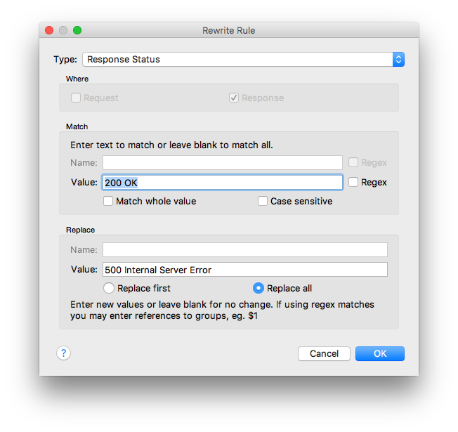 - Una para modificar el Response Status de 200 a 500, eligiendo el tipo Response Status en el desplegable.
