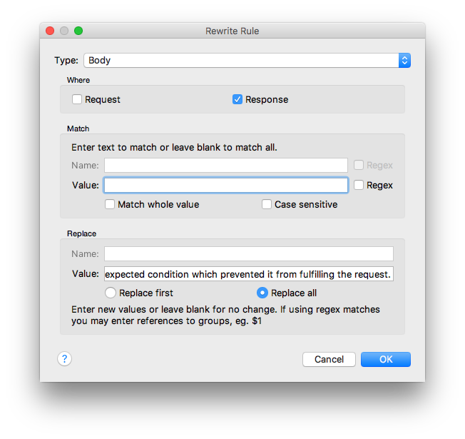 - Una para cambiar la respuesta del json o xml que se devuelva a un mensaje de error, eligiendo el tipo Body en el desplegable.