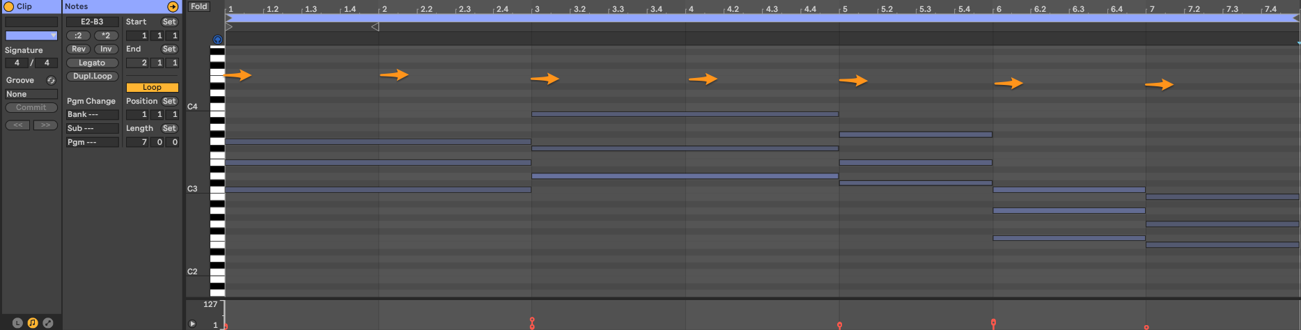 En esta imagen las flechas naranjas se corresponden con cada vez que he pulsado en el teclado el cursor derecho al mismo tiempo que tocaba el acorde en el teclado MIDI, es decir con cada compas tal como he definido en el paso 2.