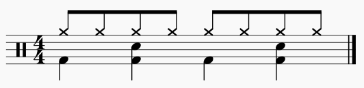He hecho una transcripción aproximada con MuseScore de un compas para la batería y el bajo.