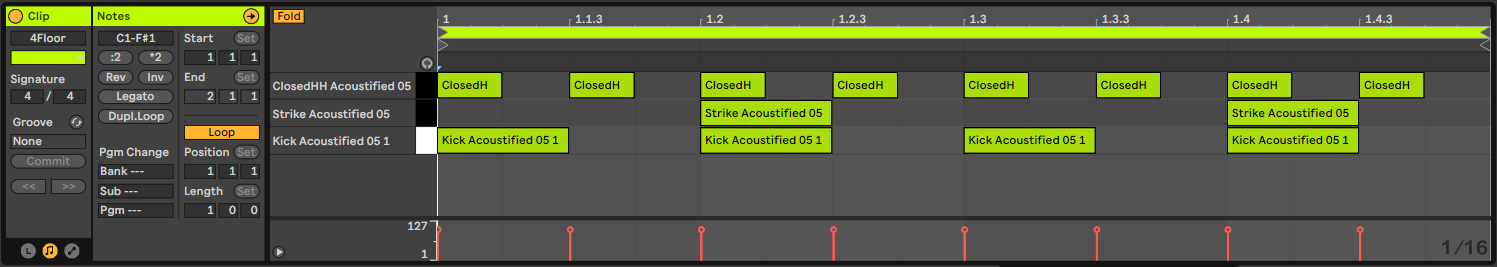 Comenzamos con un ritmo en 4/4 con un bombo en cada pulso, que se suele llamar "four to the floor" y es la base del muchos estilos de música de baile. Por tanto tendremos un ritmo cuadrado y exacto, sin swing.