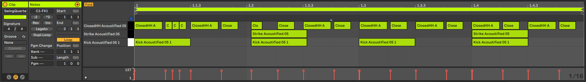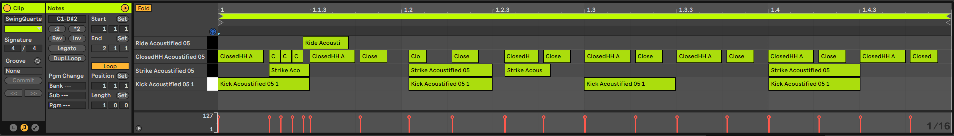 A nivel técnico la forma de conseguir swing es retrasar el inicio de las notas no acentuadas para que no caigan justo en el pulso. Esto se traduce en que en general tenemos que atrasar las notas pares. Para ilustrarlo vamos a hacer un sencillo experimento con Ableton Live.