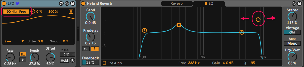 Respecto a la configuración del Hybrid reverb, estoy usando el sonido de una cueva de homínidos (y lo que se disfruta escribiéndolo...) y el algoritmo Quartz en serie. Uso el freeze a partir del segundo 16 y luego activo el "freeze in" en el 33 aproximadamente. El predelay es esencial aquí para jugar con el sonido de la guitarra y de hecho la guitarra se incorpora un poco más tarde y aprovecho que el sonido seco aislado ya no existe. Otro truco curioso es que utilizo el ecualizador del Hybrid reverb conectado a un LFO y se va moviendo la frecuencia de corte de las frecuencias más agudas. Este movimiento se ajusta al ritmo de la guitarra para ir sacando un poco de la cola del reverb.