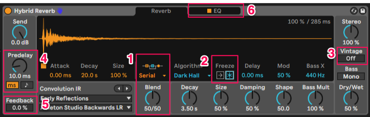 Voy a empezar por el Hybrid Reverb que son dos reverbs pegados, un convolution reverb y un reverb basado en algoritmos, como podría ser el pedal de guitarra Slö que tiene tres algoritmos seleccionables dentro.