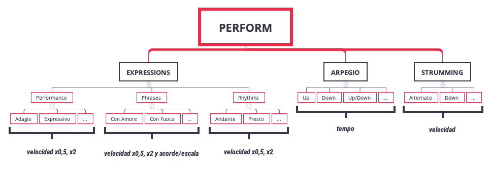 Nos permite modificar la expresión de la interpretación con elementos que vienen de la teoría musical. A continuación incluyo un diagrama para ver las posibilidades de esta pequeña sección y las variables a modificar por cada una.