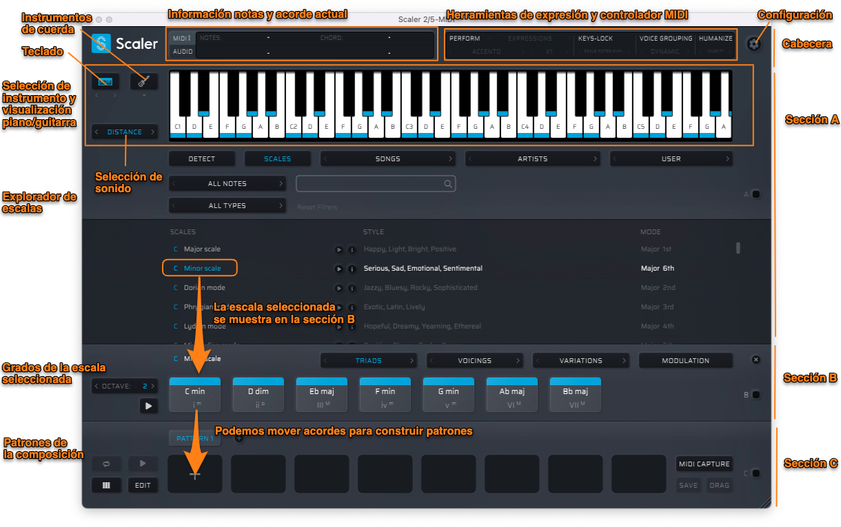 Para acabar este artículo y que no me quede infinito, vamos a asentar el concepto básico del uso de Scaler: Si quiero crear una canción con Scaler 2, elegiré una escala en la sección A, probaré como suenan esos acordes con ayuda de un teclado MIDI y probablemente varias opciones de la cabecera. Con eso y con un poco de teoría musical sobre el rol de cada grado de una escala, habrá una secuencia de acordes que me guste. Esas secuencias las puedo ir moviendo a la sección C y ahí contruir la estructura con las diferentes secciones de la canción.