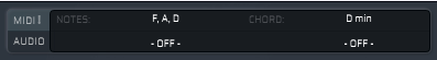 La parte superior del plugin contiene una serie de herramientas que divididas en dos bloques. El primero nos identifica las notas y el acorde que estamos tocando en el controlador MIDI.
