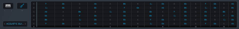La visualización del teclado es muy útil y nos va a indicar siempre que notas están en la escala elegida. Podemos cambiar la visualización al mastil de un instrumento de cuerda que puede ser muy util para quien suele componer con guitarra por ejemplo y quiere llevarse un acorde a una grabación de instrumento real, pudiendo elegir diferentes afinaciones o un bajo incluso.