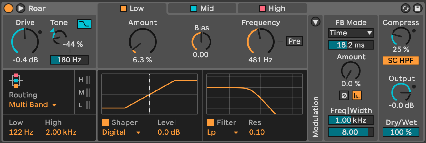 Roar es una especie de excitador multibanda, que permite configurar diferentes algoritmos para distorsionar esas bandas de frecuencias. Es interesante por la misma razón que lo son esos plugins de ecualizadores o compresores clásicos que generan ciertos harmónicos... pues aquí tenemos un dispositivo de Live que puede cambiar el carácter de un sonido en ese sentido, en otros más experimentales, y es muy fácil de usar.