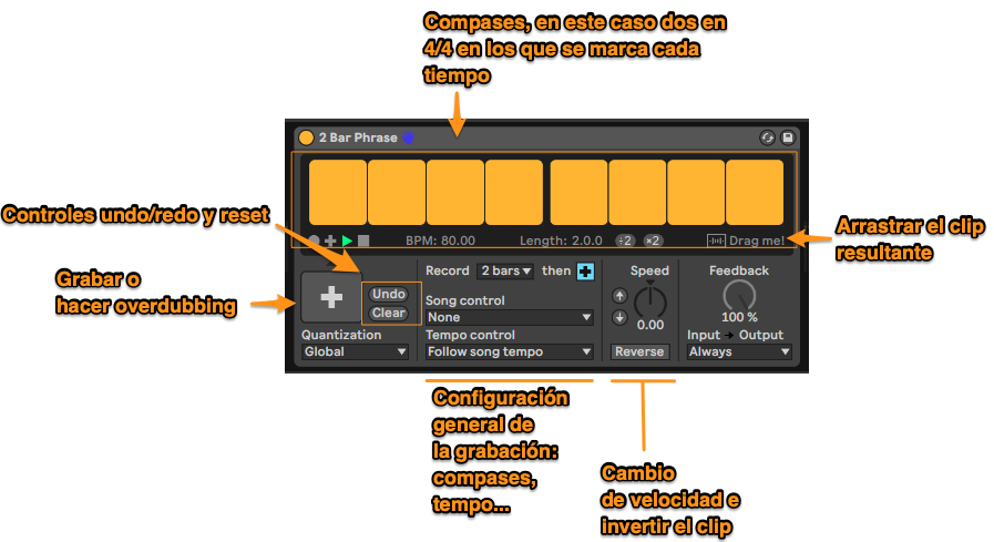 La zona superior se usa como guía visual para saber en que tiempo de qué compas estamos. Por debajo tenemos varios controles pero el principal es el botón de grabar o hacer overdubbing.