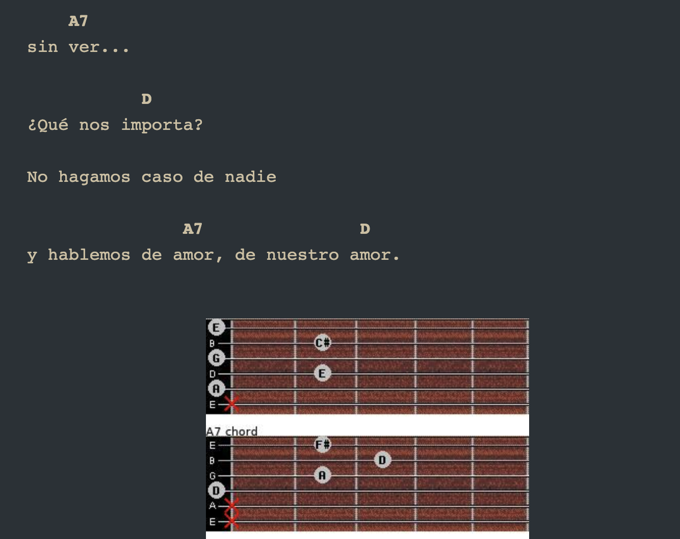 El uso es muy sencillo porque se basa en bloques formateados, y permite solo la opción de renderizar los acordes en diferentes instrumentos si acabamos la línea de acordes con "%". En ese caso nos colocara bajo la letra una serie de imágenes con los acordes usados.