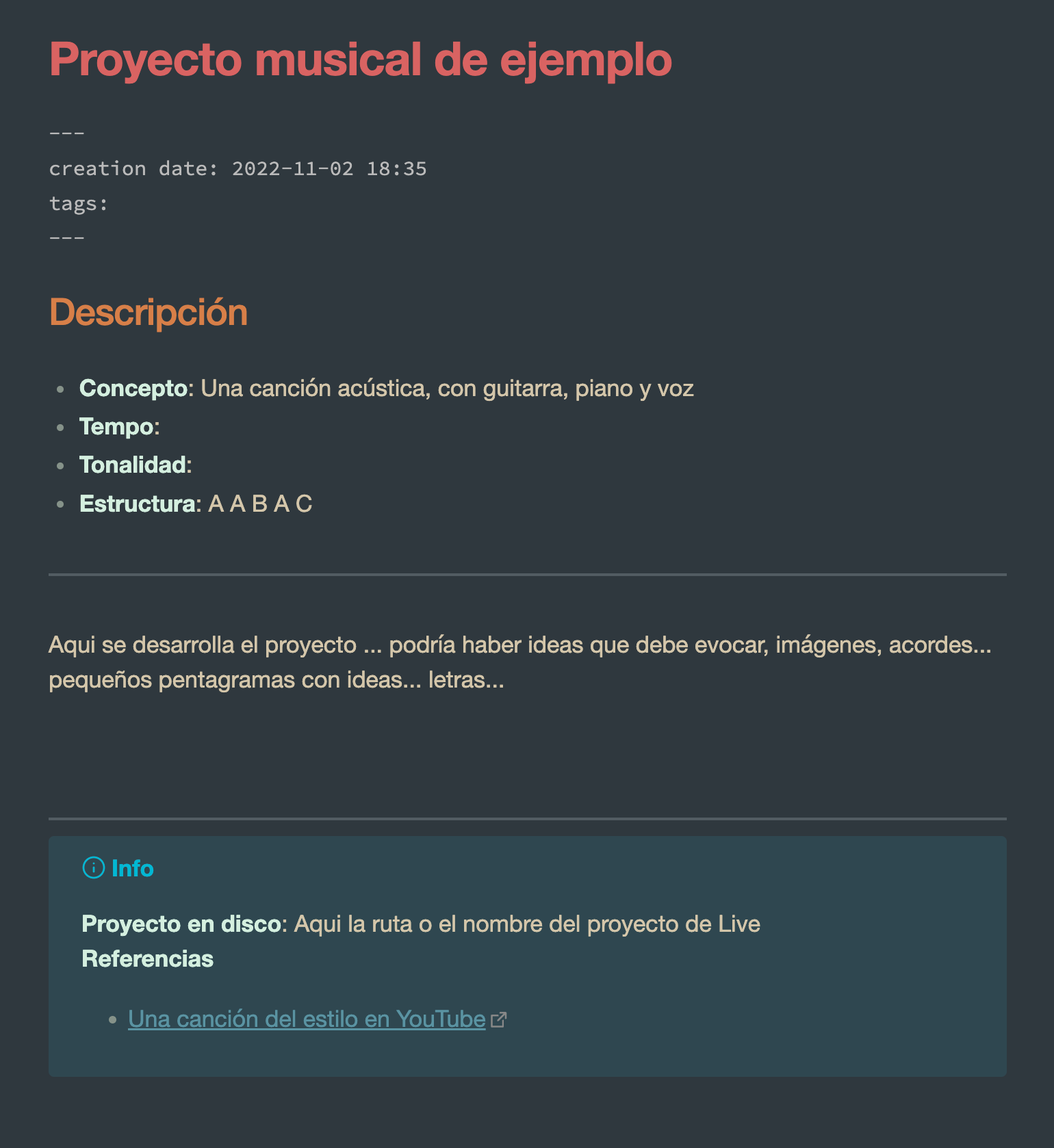 La música es una de mis areas de interes general, así que tiene una carpeta dedicada en el "vault" de Obsidian, siguiendo un poco la filosofía de GTD. Dentro de la carpeta tengo una subcarpeta llamada "Proyectos" dónde hago el seguimiento de cosas en las que esté trabajando. Ya sean ideas de letras, proyectos de producción o simplemente los acordes de una canción que me gusta y que estoy sacando.