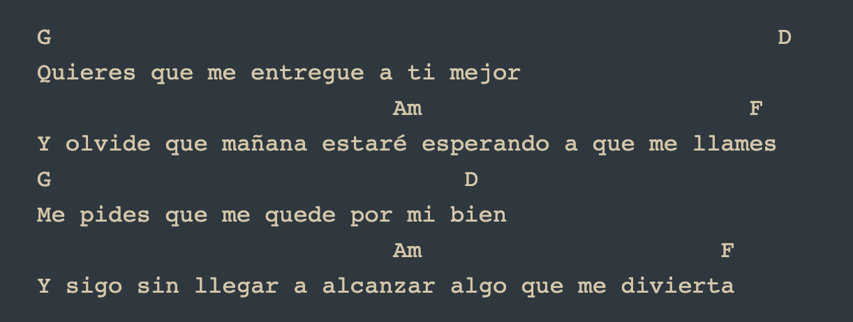 Por último, el objetivo es documentar los acordes que uso y la letra. Esto es importante porque muchas veces esta información no puede reflejarse directamente en Live, o por ejemplo si quieres tocar la canción con una guitarra, necesitas al menos un documento en el que tengas tu canción con los acordes. Esto podrías hacerlo en un cuaderno, pero con el tiempo los cuadernos se pierden y buscar es más lento que en un buen sistema indexado.