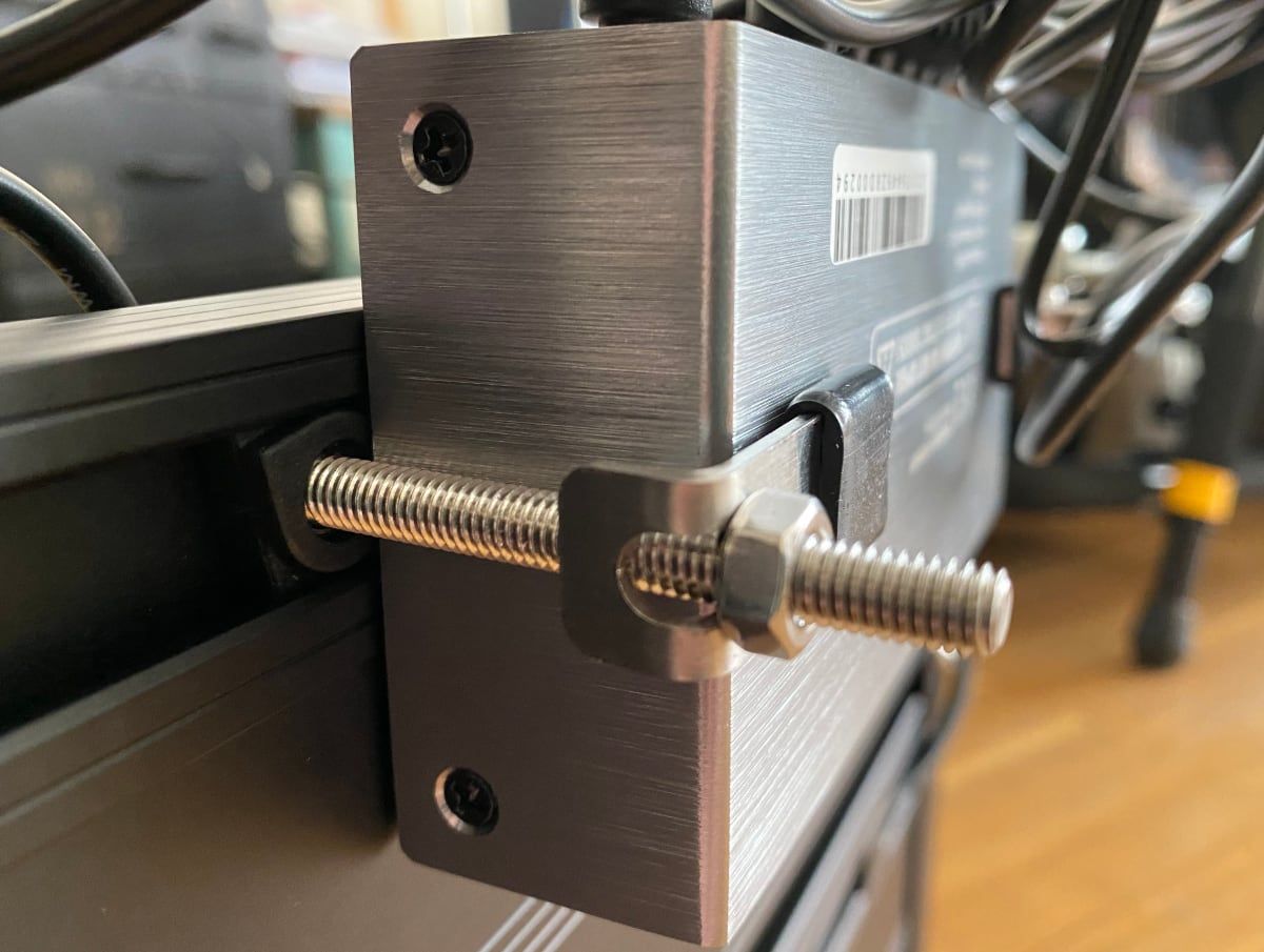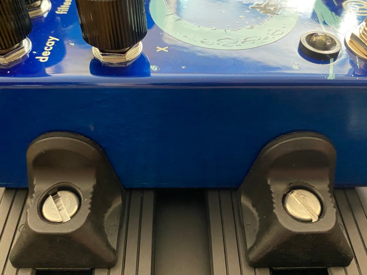 La pedalera en cuestión está diseñada por una empresa de Barcelona llamada Aclam Guitars y utiliza un sistema de railes y unas sujecciones laterales que llaman "fasteners" para sujetar los pedales a la estructura firmememente y sin necesidad de velcro. Ni hablar de tener que quitar patitas de goma a pedales que los tengan ni enredarse a cuadrar tiras de velcro sobre la estructura. Se monta en 5 min y en otros 5 colocas los cables en las guias. Igual con la fuente de alimentación. Es un gran ejemplo de diseño industrial funcional.