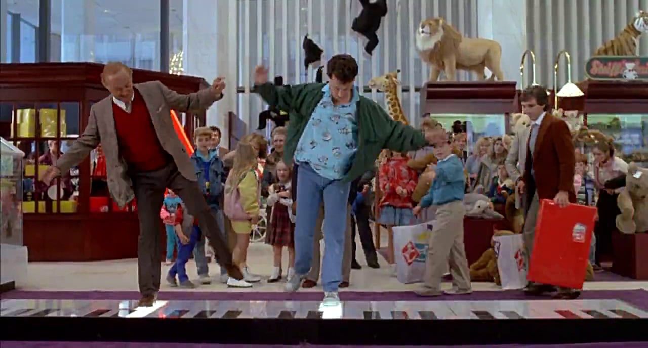 Hace años dediqué muchas horas a tocar la guitarra y el bajo, y disfruté la experiencia con la misma curiosidad y el asombro con los que un niño descubre la playa en compañía de sus padres. He elegido esta divertida escena en la que un chaval, en el cuerpo de un adulto, bailotea sobre unas teclas de piano y deleita a un puñado de clientes, que se convierten en público improvisado, para declarar el amor que siento por la música. De paso, me recuerdo que no debería perder nunca las ganas de jugar y de reír. Ni la espontaneidad. Quiero ser GRANDE sin perder la mirada del chiquillo. Ese niño que, por primera vez, escuchó Yellow Submarine en clase de música; el mismo que, cuarentaitantos años después, tararea You´ve got a friend in me, o silba las primeras notas al piano de Moanin´, de Art Blakey, mientras lleva a cabo su jornada de trabajo.