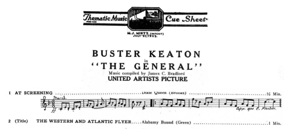 No aparece la de la película de este fotograma pero si se puede encontrar la partitura de referencia para The General, tambien de Buster Keaton, que se puede bajar en PDF. Es algo así como una referencia de la melodía y el caracter de la música asociado al punto exacto del metraje. Realmente fascinante.