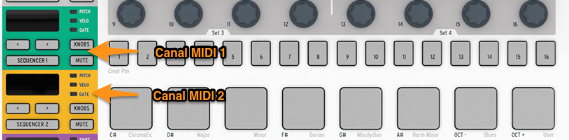BeatStep cuenta con dos secuenciadores melódicos, marcados con los colores verde y amarillo. Estos sacan señales por defecto en los canales MIDI 1 y 2 respectivamente.