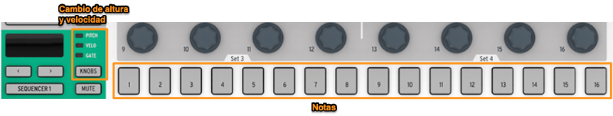 Cada nota se puede modificar en cuanto a la velocidad o la altura de la nota usando el botón "knobs" y luego el knob correspondiente a la nota que vayamos a modificar.