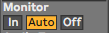 - Off: desactiva la monitorización. Esto es útil cuando sacamos señales a instrumentos externos y no queremos que las señales que sacamos al instrumento vuelban en bucle a Ableton Live.