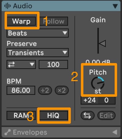 La estrategia aquí es desactivar las cosas geniales de Ableton Live como el warping, asociado al cambio de tono, de forma que vamos a cambiar la calidad del sonido, al hacer el flatten generamos un nuevo sonido que volveremos a estirar, con lo que a efectos prácticos estamos generando un sonido artificialmente sampleado con peor sample rate del que nos permite nuestro software.