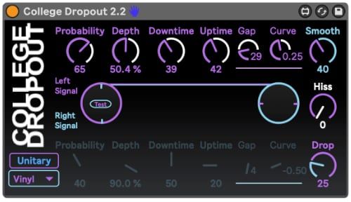 Por último tenemos muchos dispositivos Max for live que hacen diabluras con el sonido. Voy a mencionar aqui College Dropout que genera caidas de volumen aleatorias con un cambio de tono. La descripción de su desarrollador es divertida y deja claro su objetivo:
